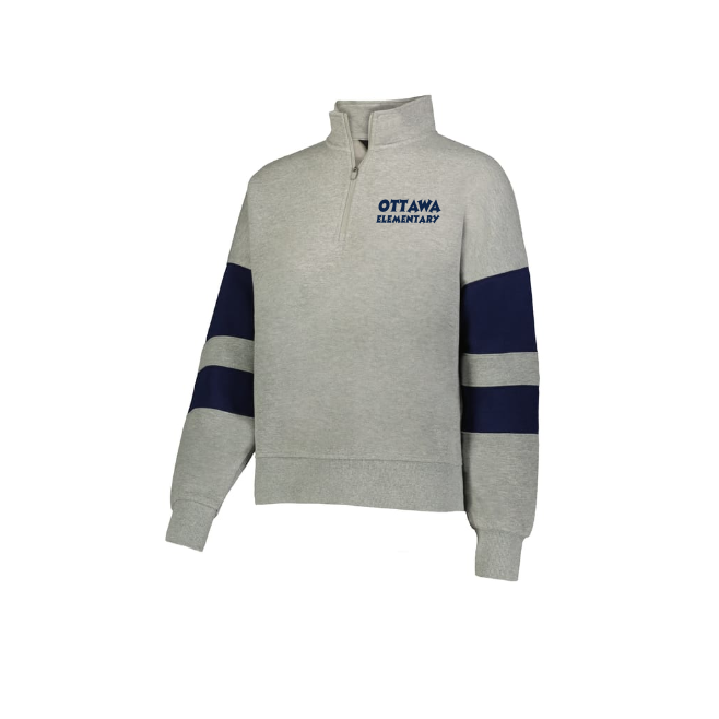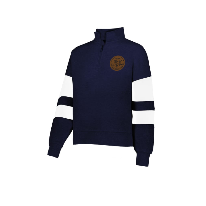 9-ounce, 60% cotton/40% polyester athletic fleece Ladies' fit Hanger loop label Quarter zip pullover style Dropped shoulder sleeves for mobility and comfort Spandex rib-knit cuffs and bottom band Modest cropped length Embroidered logo or lasered leatherette patch