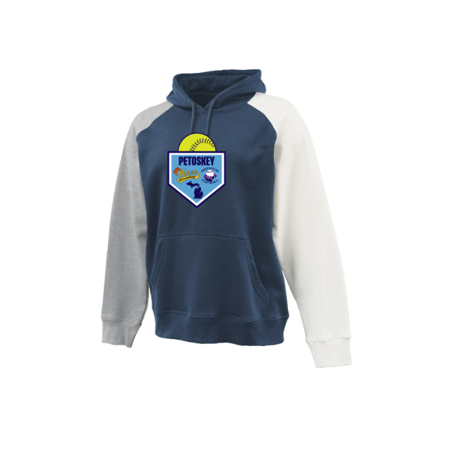 9.0 oz premium fleece Contrast color raglan sleeves Fully lined hood with matching drawcord Rib cuffs and waistband 60% cotton/ 40% poly Screen printed design