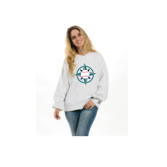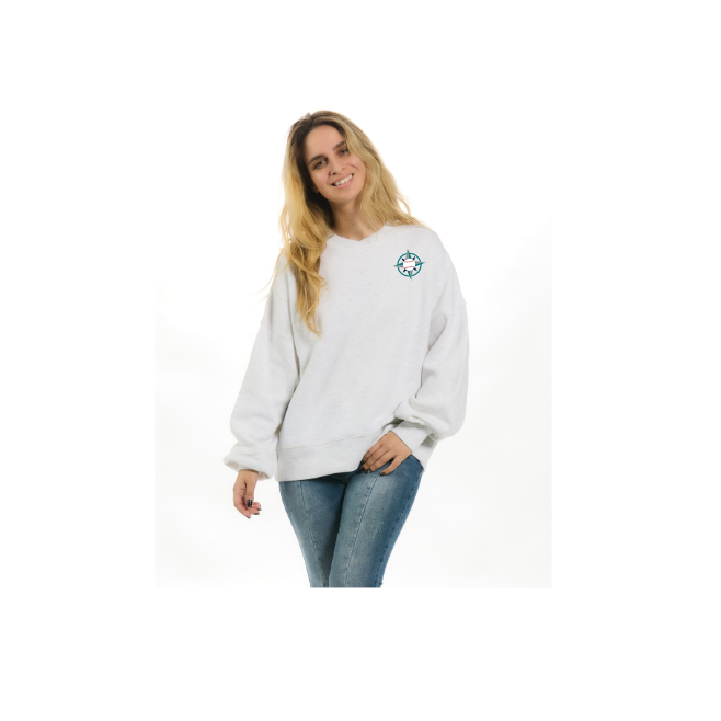 7.7 oz., 55% cotton / 45% polyester 3 end fleece Loose fit crew with slight crossover neck detail Drop shoulder 3" 2x1 ribbing sleeve cuff and bottom hem 1" 2x1 ribbing at neck Flat woven herringbone neck taping Screen printed design