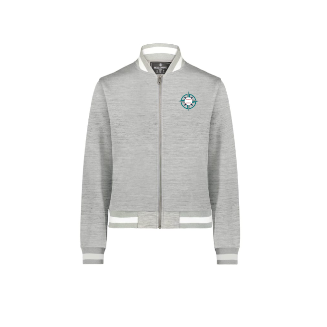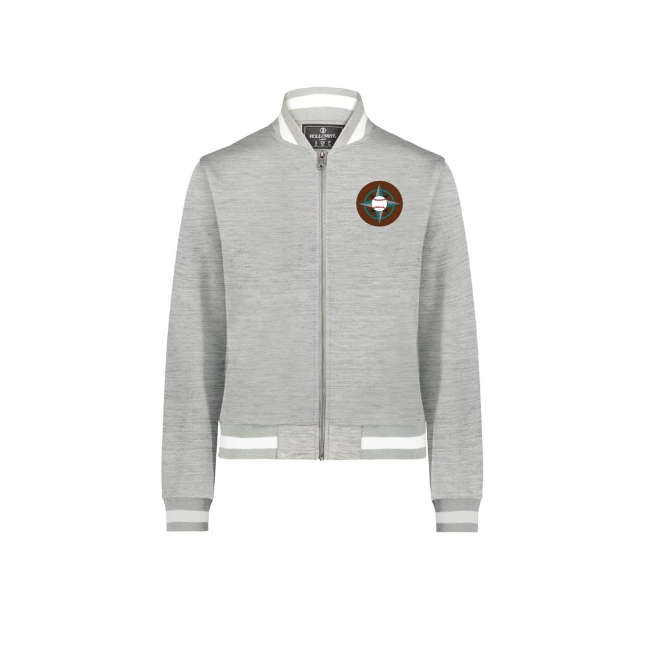 100% polyester double-knit Ladies' fit Woven label Front zipper Set-in sleeves Front pockets Dual inside pockets Striped rib-knit collar, cuffs and bottom band Embroidered logo or printed patch