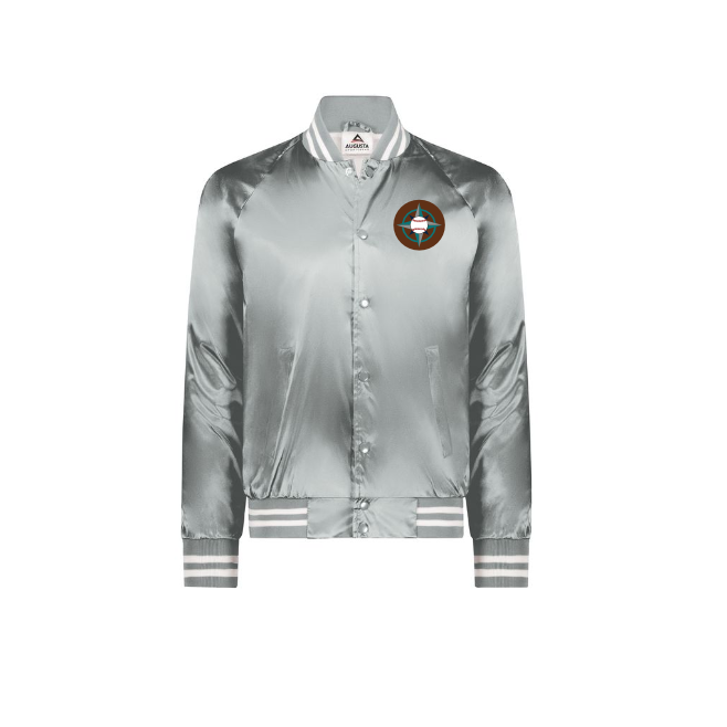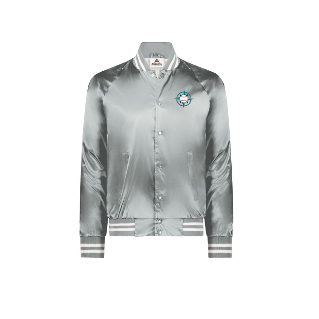 Outer shell of 100% nylon satin  Lined with 100% polyester Woven label  Snap front  Raglan sleeves for maximum mobility  Striped rib-knit collar cuffs and bottom band  Front pockets  Water-resistant Embroidered logo or printed patch