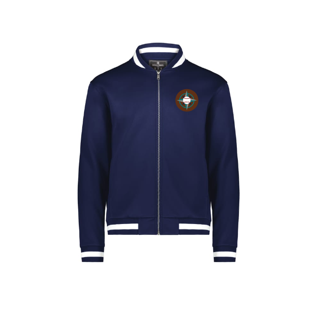100% polyester double-knit Woven label Front zipper Set-in sleeves Front pockets Dual inside pockets Striped rib-knit collar, cuffs and bottom band Embroidered logo or printed patch